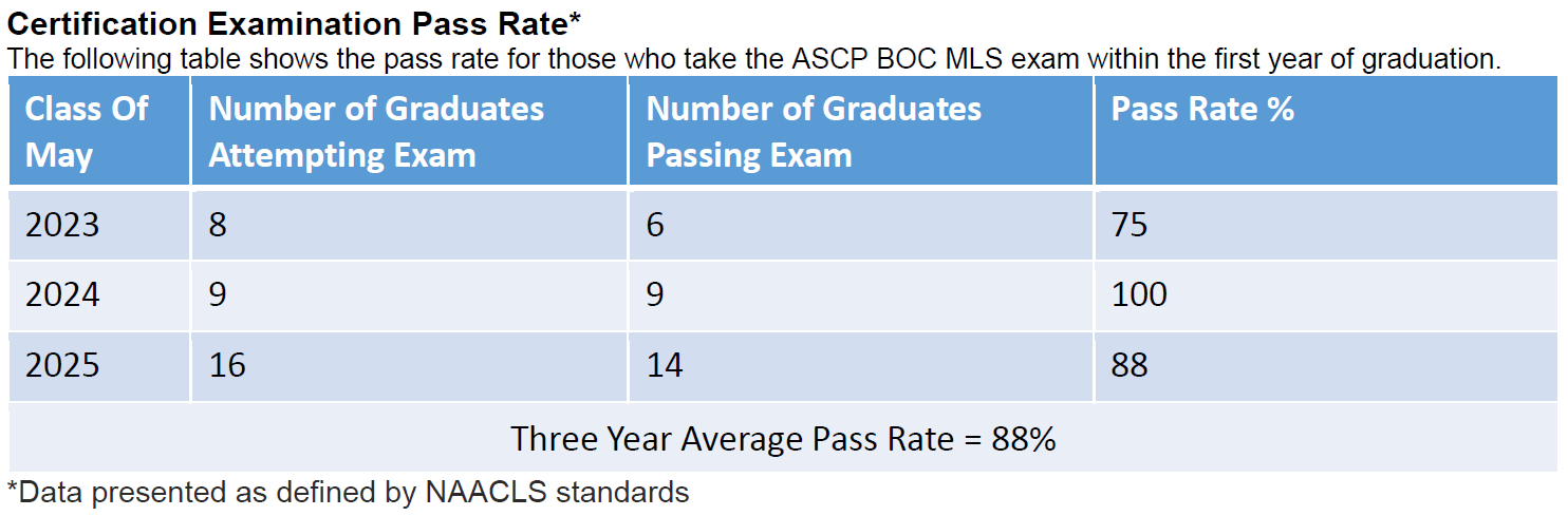 In order to maintain accreditation status, programs must meet NAACLS benchmark outcome measures including certification, graduation, graduate placement, and attrition rates. Please scroll below to view the outcomes measured for the MLS (BS) and HTL (BS) programs. Outcomes measured for the Master of Science (MS) in medical laboratory science will be provided once program data is available.