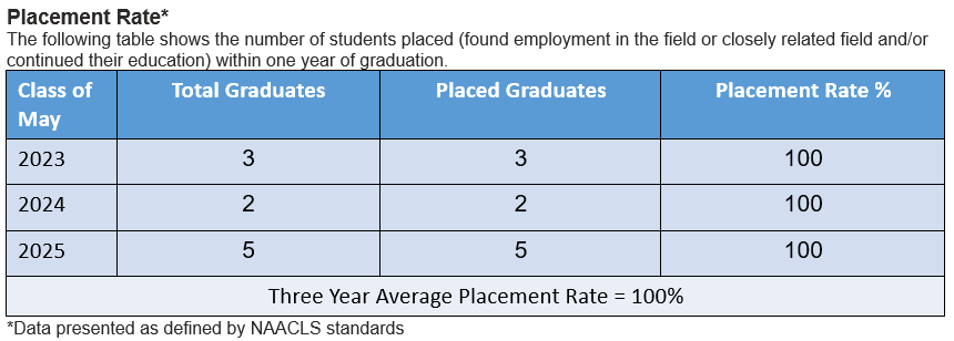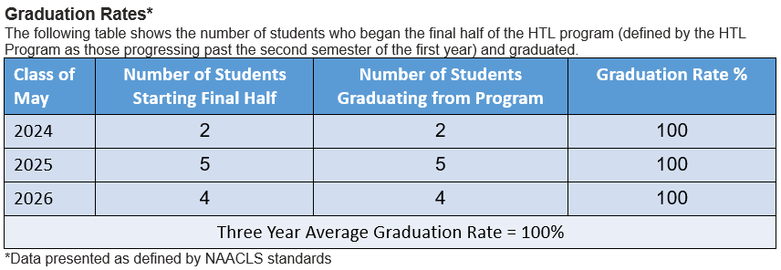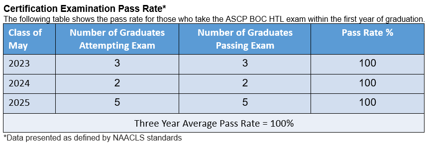 In order to maintain accreditation status, programs must meet NAACLS benchmark outcome measures including certification, graduation, graduate placement, and attrition rates. Please scroll below to view the outcomes measured for the MLS (BS) and HTL (BS) programs. Outcomes measured for the Master of Science (MS) in medical laboratory science will be provided once program data is available.